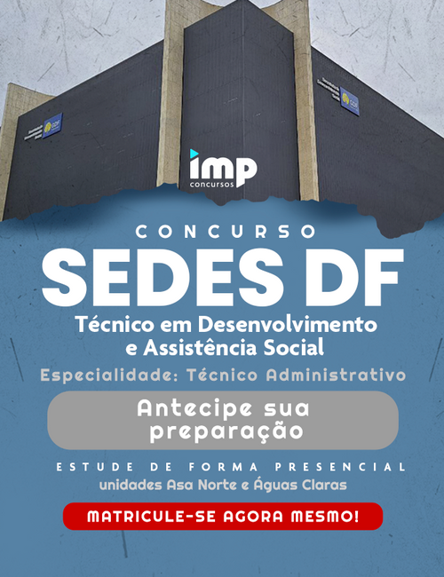 Presencial Águas Claras Turma confirmadaSEDES DF – TÉCNICO EM DESENVOLVIMENTO E ASSISTÊNCIA SOCIAL DO DF – ESPECIALIDADE: TÉCNICO ADMINISTRATIVO (GMTAC-4417)